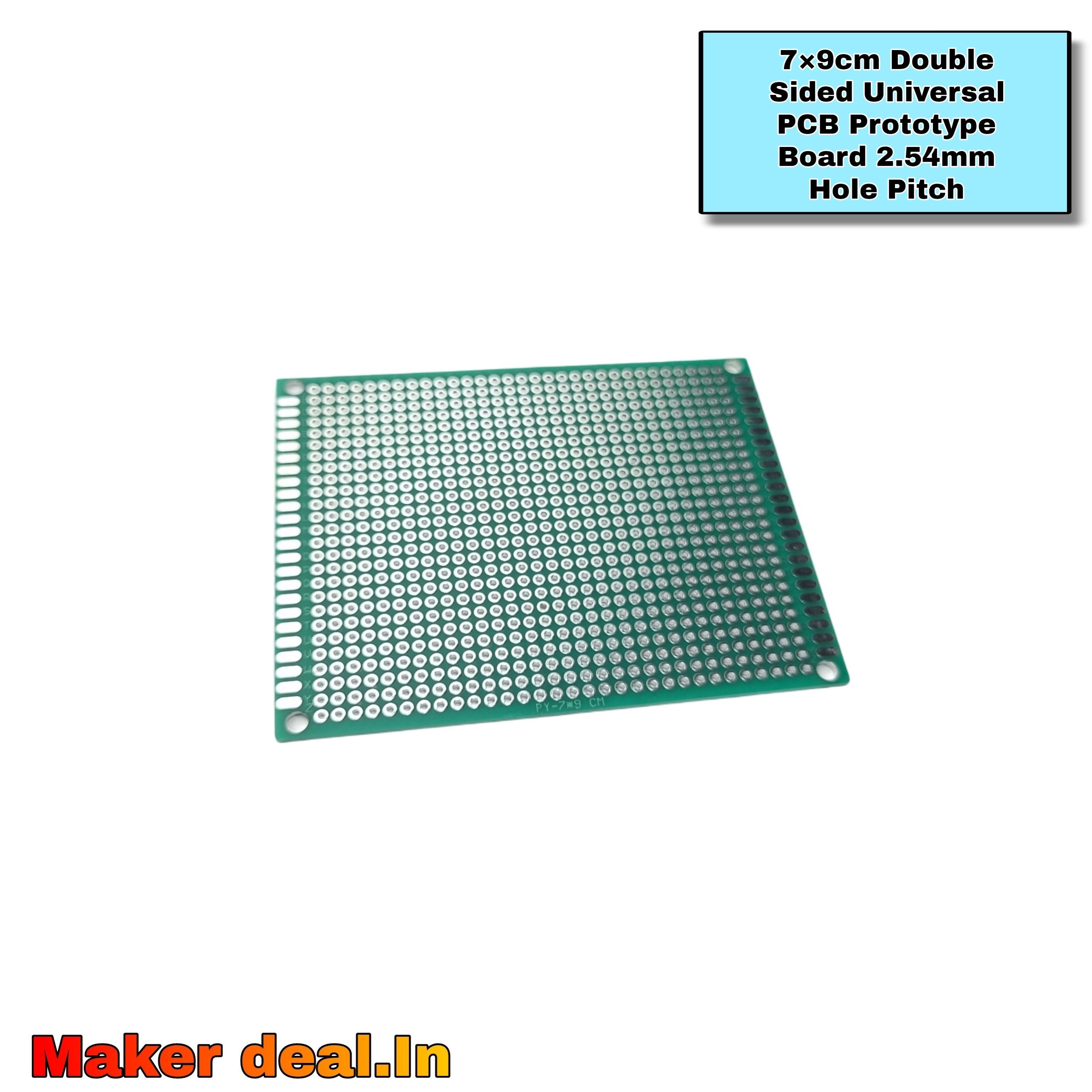 The 7×9 cm Double-Sided Universal PCB Prototype Board is a versatile and durable prototyping board designed for building custom electronic circuits. It features a grid of plated-through holes with a standard 2.54mm (0.1-inch) pitch, making it compatible with a wide range of through-hole components, ICs, and connectors.