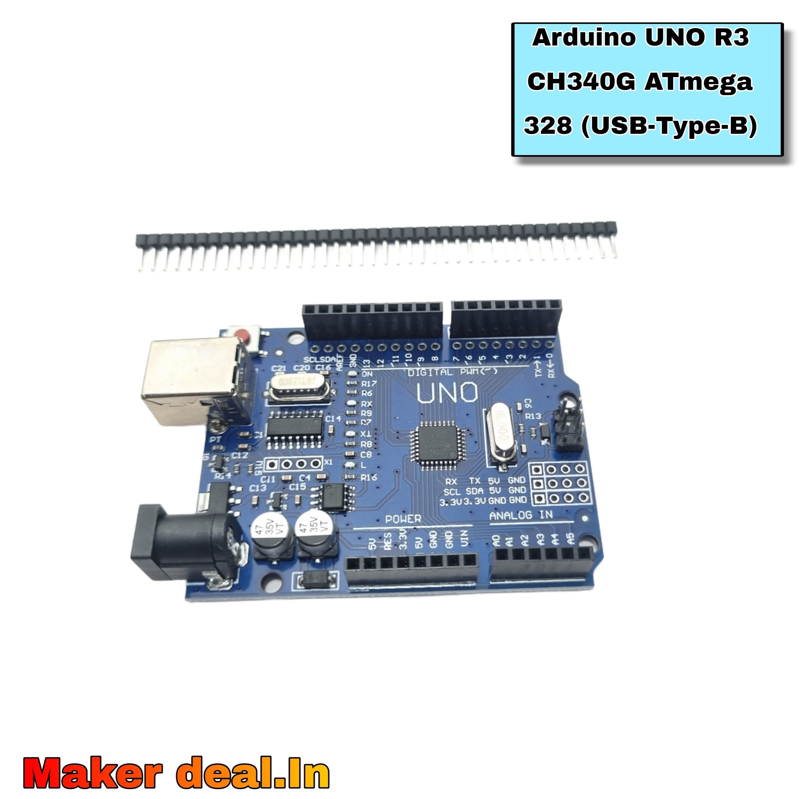 The Arduino Uno R3 CH340G ATmega328 is a microcontroller board based on the ATmega328P chip. It features the CH340G USB-to-serial converter instead of the traditional ATmega16U2, making it a cost-effective alternative. It uses a Type-B USB port, operates at 5V, and includes 14 digital I/O pins (6 PWM), 6 analog inputs, and a 16 MHz clock speed. Ideal for beginners and DIY electronics projects.