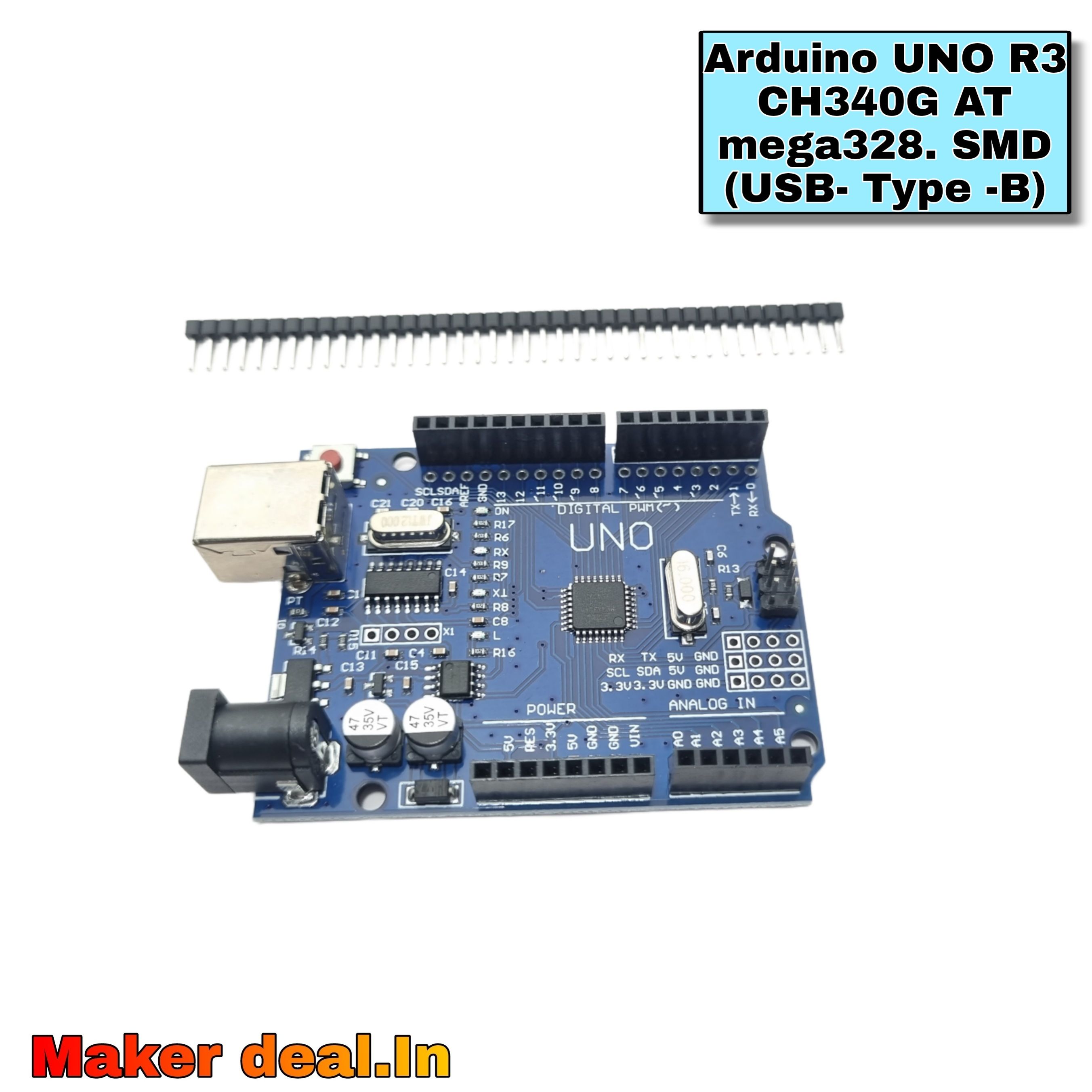 The Arduino Uno R3 CH340G ATmega328 SMD (USB Type-B) is a microcontroller development board based on the ATmega328P SMD chip. It features the CH340G USB-to-serial converter, making it an affordable alternative to the standard Uno R3. Compatible with the Arduino IDE, it is ideal for beginners and professionals working on electronics, robotics, IoT, and automation projects